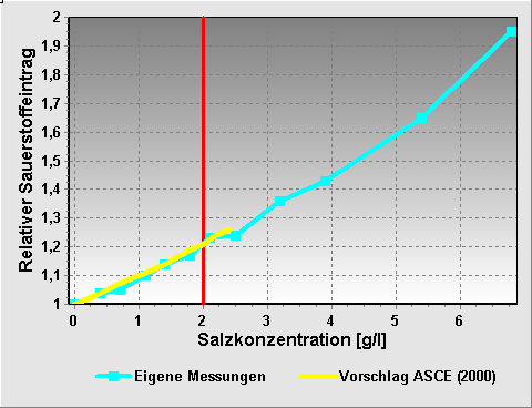 Die bei Reinwasserversuchen übliche Sauerstoffbindung durch Natriumsulfit führt im Verlauf einer Versuchsreihe zu einer fortschreitenden Aufsalzung des Wassers. Als Folge dieser Aufsalzung verringert sich bei Druckbelüftungen die Größe der Luftblasen, was wiederum bei gleichbleibendem Luftdurchsatz eine Erhöhung des Belüftungskoeffizienten nach sich zieht. Man erhält demnach bei hohen Salzgehalten zu hohe Messwerte für die Sauerstoffzufuhr.