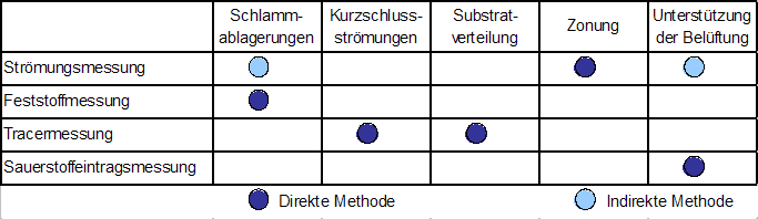 Dabei ist zu beachten, dass nicht jede Methode für jede Funktion geeignet ist. Die nachfolgende Tabelle stellt den Versuch dar, den einzenen Funktionen eines Umwälzsystems die jeweils in Betracht kommenden Untersuchungsmethoden zuzuordnen. Dabei wird unterschieden nach direkten und indirekten Methoden. Indirekte Methoden sind dadurch gekennzeichnet, dass sich Schlüsse über eine korrekte Funktion nur unter Hinzuziehung von Erfahrungswerten ziehen lassen (Beispiel: Aus Strömungsmessungen lassen sich Schlüsse auf mögliche Schlammablagerungen nur ziehen, indem die Messergebnisse mit Erfahrungswerten für ausreichend hohe Strömungsgeschwindigkeit verglichen werden).